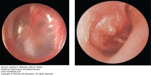 Acute otitis media. (A) A normal tympanic membrane is shown with a shiny light reflex. (B) The tympanic membrane is inflamed (red), bulging, and has a purulent effusion consistent with acute otitis media. The light reflex is gone. (Used with permission from Dr. Shelagh Cofer, Department of Otolaryngology, Mayo Clinic.)