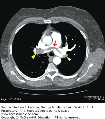 Contrast CT angiogram of the chest showing a "saddle" pulmonary embolism (red arrow) as well as filling defects in the left and right pulmonary artery branches (yellow arrowheads) secondary to obstruction by thromboembolic materials. Read more in Respiratory: An Integrated Approach to Disease, Chapter 15.