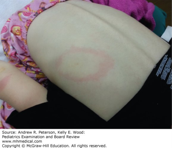 Her mother noted an approximately 2-cm red circular lesion a week ago. It has increased in size slowly over the last week and now has central clearing. (See Figure 20–6.) The girl has been outside a lot this summer but does not remember any tick bites. She is afebrile and has no other symptoms. You suspect Lyme disease.