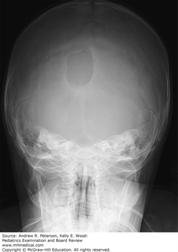 Skull finding in Langerhans cell histiocytosis (LCH). This plain film exhibits a large lytic lesion in the right occipital bone. There is minimal sclerosis and no periosteal reaction. This appearance is consistent with skull lesions common in LCH. (Used with permission from Adam D. Wolfe, MD, PhD.)