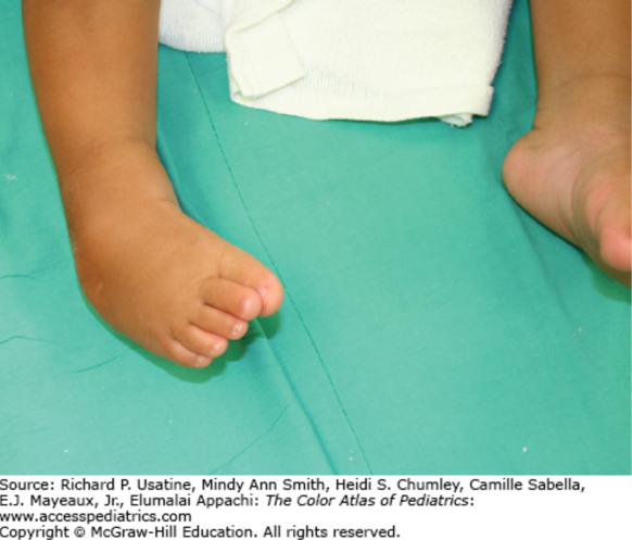The correct answer is “A.” Arthrogryposis is the presence of congenital joint contractures, usually associated with decreased fetal movement due to either a restricted intrauterine environment or intrinsic muscular or neurologic disorders, and occurs in approximately 1 in 10,000 live births. The most common cause is amyoplasia, an abnormality of muscle development often referred to as arthrogryposis multiplex congenita. Arthrogryposis may also occur in patients with abnormalities of the central nervous system, in the presence of oligohydramnios, or in certain genetic syndromes, such as diastrophic dysplasia or Larsen syndrome. In addition to the multiple joint contractures, which can include hand and foot deformities as well as dislocate hips, amyoplasia is characterized by cylindrical-shaped limbs with lack of flexion creases, dimpling at joints, and normal cognitive function. Difficulty swallowing and breathing may occur at birth. Abnormal cognitive development would suggest an underlying neurologic abnormality as the cause of multiple joint contractures.