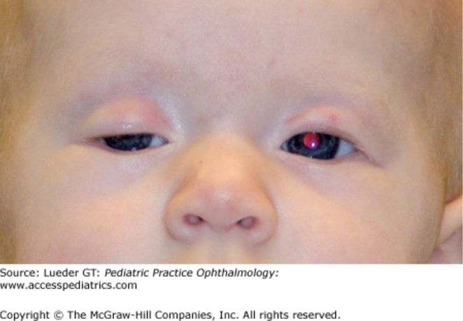 She has no concerns other than the fact that the infant’s left eye does not seem to be as big as the right eye. On exam, you notice a very faint lid crease, eyelid lag on downgaze, barely visible corneal reflex, and poor elevation of the upper lid on the left side. The rest of the exam, including pupils and extraocular movements, is normal.