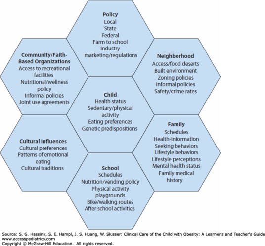 Take a look at below Figure 21-1 from Clinical Care of the Child with Obesity to study an ecological model for childhood obesity to understand the underlying factors that contribute to the epidemic: