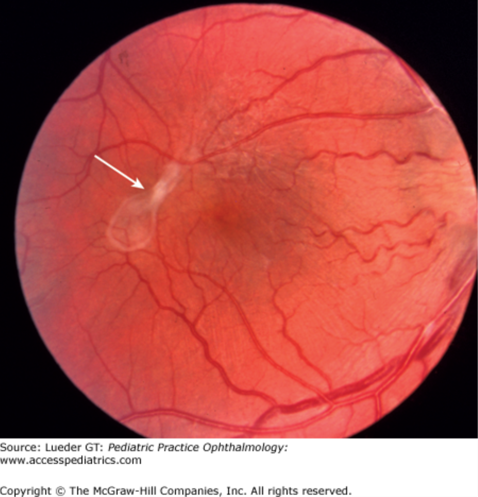Neurofibromatosis type 2. Epiretinal membrane (arrow). Note distortion of retinal blood vessels on right side of figure, caused by traction from the membrane.