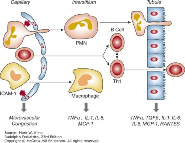 Major microvascular changes and inflammatory pathways induced by acute kidney injury. The release of cytokines and chemokines from infiltrating cells and injured tubules can amplify the destructive process. Strategies that modulate the inflammatory response may prove beneficial in human acute renal failure.