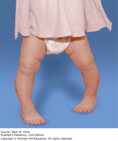 His parents think he may have attained 6 to 10 words. He walks fairly well but does tend to trip and fall. When he falls he gets up right away and carries on with his activities. He eats a varied diet without any restrictions. Their main concern today is that he looks “bowlegged,” especially when ambulating. The father reports that he, too, was a bit bowlegged when he was young but did not receive treatment and “grew out of it.” Exam demonstrates mild genu varum, which clinically appears symmetric. Gait demonstrates a wider base, with toes pointing to the midline bilaterally (L > R), and no lateral thrust, waddling, or antalgia. X-rays demonstrate mild genu varum bilaterally affecting the femur and the tibia, with normal-appearing physes.