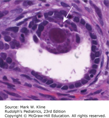 Characteristic cytomegalovirus (CMV) inclusion body in biopsy from congenitally infected infant. Classic “owl’s eyes” CMV-associated inclusion body noted in renal biopsy of infant with congenital CMV infection and (unrelated) renal disease. Viral inclusion found within renal tubule (arrow) in infant with high-grade DNAemia, viruria, and sensorineural hearing loss. This infant had no other stigmata of congenital CMV infection.