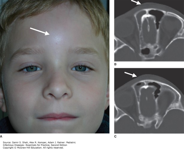(A) A 7-year-old boy with Pott puffy tumor of the forehead (white arrow); (B,C) axial CT scan (bone window settings) showing left frontal sinusitis and swelling of the skin (the abscess) over the frontal sinus.