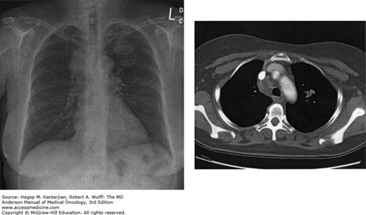 Stage IIIB non–small cell lung cancer (NSCLC). This patient presented with chest pain, and the chest x-ray (left) showed an approximately 4.0- by 3.0-cm mass in the left upper lobe and an additional mass in the right mediastinum. Initial computed tomography (CT) revealed a 4.5-cm mass in the left upper lobe and a 5-cm mass in the paratracheal region. Biopsy confirmed NSCLC. Staging evaluation showed no distant metastatic disease (T2N3M0). The patient was treated with concurrent chemotherapy and radiotherapy. The posttreatment CT (right) showed significant therapeutic response.