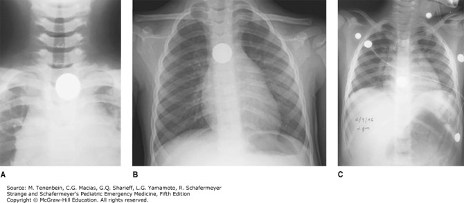 Figure 12-2 of the Foreign Bodies chapter highlights the three most common sites for esophageal foreign body: A. thoracic inlet (60%–70%); B. mid-esophagus (10%–20%); C. lower esophageal sphincter (20%).