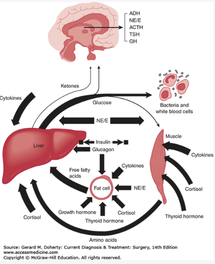 During sepsis, cytokines (IL-1, IL-2, TNF) released by lymphocytes and macrophages contribute to catabolism of muscle and adipose tissue and amplify the neurohormonal response to antecedent trauma.