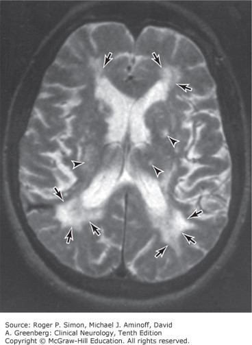 Cerebrovascular disease. Vascular disease is generally considered the second most common cause of dementia, after Alzheimer disease, and many patients have features of both diseases. This image shows a T2-weighted MRI in vascular dementia, showing foci of abnormal high signal intensity adjacent to the lateral ventricles (arrows) and within the basal ganglia (arrowheads).