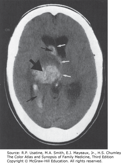Hemorrhagic stroke. CT image demonstrates bleeding in the right basal ganglia (large black arrow) and into the ventricles (small black arrows). Blood appears white on the CT scan. The white arrows illustrate midline shift. (Reproduced with permission from Chen MYM, Pope TL, Ott DJ. Basic Radiology. New York, NY: McGraw-Hill Education; 2004.)