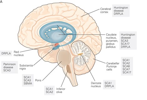 Chapter 44 of Principles of Neuroscience, 5e, extrapolates features of neurodegenerative disorders from mouse models. Figure 44-2A (below) localizes cell death according to different neurodegenerative disorders.