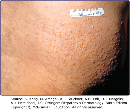 Eruptive xanthomas appear as yellow-orange papules and plaques on a male patient with Type 2 diabetes mellitus. (Used with permission from Greg Raugi, MD.)