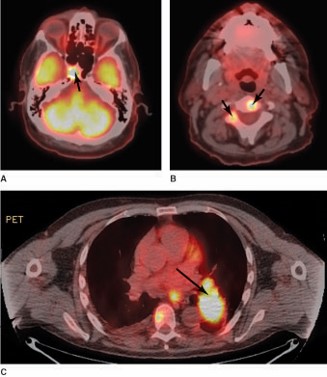 A 62-year-old man presented with a progressive right abduction deficit. Magnetic resonance imaging (MRI) showed a right cavernous sinus mass, suspected to be metastatic. Positron emission tomography-computed tomography (PET-CT) revealed the right cavernous sinus lesion and multiple metastases (short arrows), with a lung mass presumed to be the primary neoplasm (long arrow), shown in these images through the A) and B) brain and B) and C) chest. Note the normal high metabolic activity of the A) brain.