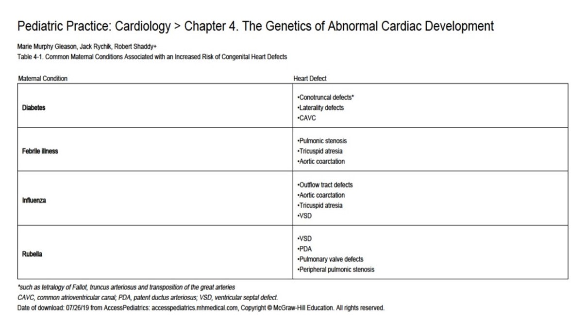 Chapter 4: D'Alessandro LA, Peyvandi S, Schachtner S, Goldmuntz E. Chapter 4. The Genetics of Abnormal Cardiac Development. In: Gleason M, Rychik J, Shaddy R. eds.Pediatric Practice: Cardiology New York, NY: McGraw-Hill; 2012. Accessed July 30, 2019.