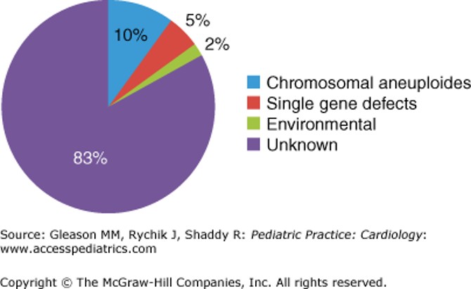 Chapter 4: The Genetics of Abnormal Cardiac Development in Pediatric Practice: Cardiology highlights the genetic underpinnings of CHDs. However, it also recognizes that most causes of CHDs are unknown, as shown in Figure 4-1 (top). Other known factors to contribute to the development of CHDs are illustrated in Table 4-1 (bottom).