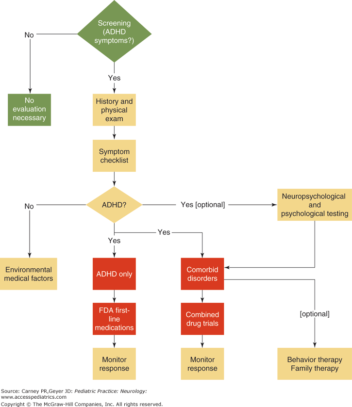 Below, Figure 9-1 of Chapter 9: Attention-Deficit/Hyperactivity Disorder in Pediatric Practice: Neurology details the steps in assessment and treatment of ADHD in children, adolescents, and adults.