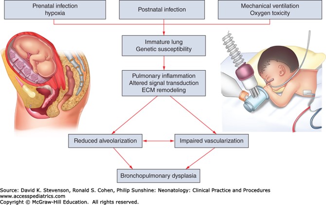 The correct answer is “E.” This infant has chronic lung disease of prematurity, also known as bronchopulmonary dysplasia. This disease is most common in infants at the extremes of viability around 23 to 25 weeks’ gestation at birth. It is generally defined as the persistent need for oxygen therapy at 36 weeks’ corrected gestational age. The fetal lungs go through expected maturation from lung bud to pseudoglandular to canalicular to saccular to alveolar. Preterm infants lack alveolarization until several months of age, adding to difficulties with ventilation and oxygenation. Both vitamin A and caffeine produce modest improvements in chronic lung disease and are administered to many preterm infants.