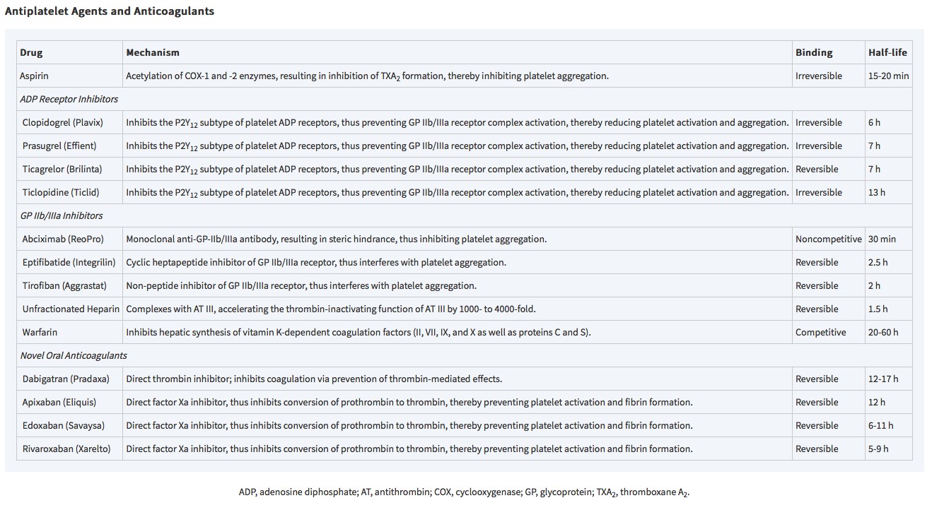 Table 14-1: Antiplatelet agents and anticoagulants (from Cohn L.H., & Adams D.H.(Eds.), (2017). Cardiac Surgery in the Adult, 5e. McGraw-Hill.)