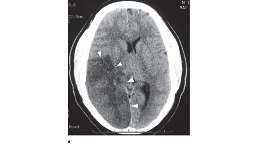 Figure legend: A. Head computed tomography scan of a patient with a 4-day-old stroke that occluded the right middle cerebral and posterior cerebral arteries. The infarcted tissue is the hypodense (dark) area indicated by the arrowheads. The patient presented with left-sided weakness and left visual field loss, but then became less responsive, prompting this head computed tomography. Note the right-to-left midline shift. Neurosurgery, Brunicardi F, Andersen DK, Billiar TR, Dunn DL, Kao LS, Hunter JG, Matthews JB, Pollock RE. Schwartz's Principles of Surgery, 11e; 2019.