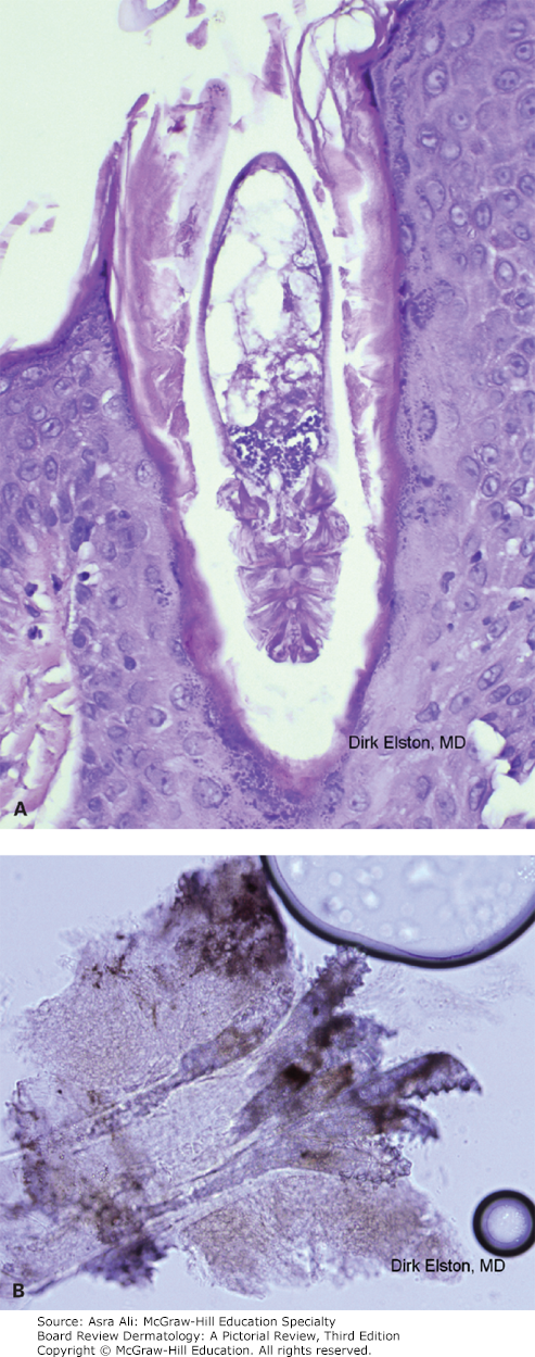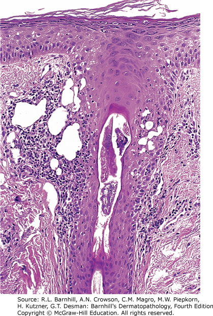 Pictured above within the hair follicle is a Demodex mite. Demodex's involvement in acne rosacea is controversial but many believe an overgrowth of Demodex and the subsequent inflammatory reaction to the mite can contribute to the pustular eruption. Resolution of facial rash with medications such as ivermectin or permethrin is further evidence of their involvement in certain types of rosacea. Histologically, follicular spongiosis and adjacent lymphohistiocytic infiltrate are suggestive of an inflammatory response to the Demodex mite. Another example of a Demodex mite within the hair follicle is shown below.