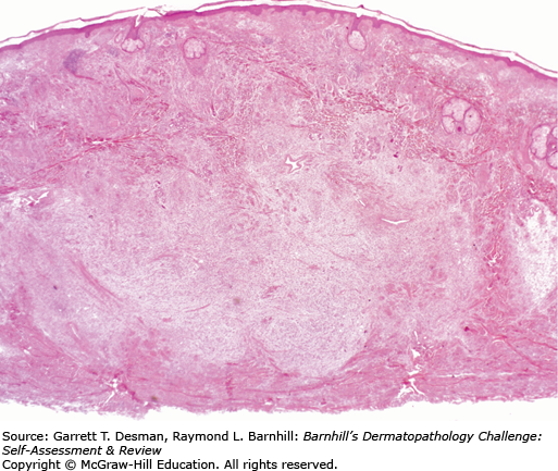 A 65-year-old woman presents with a firm, subcutaneous nodule on her left shoulder. Histologic examination reveals the photograph below.