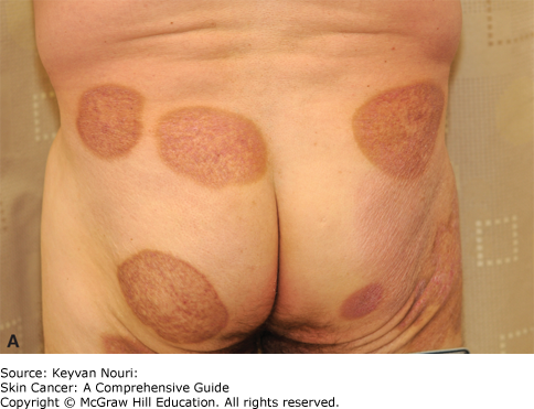 A 65-year-old male presents with a five-year history of intermittent, somewhat pruritic, erythematous patches on his buttocks and thighs shown below.