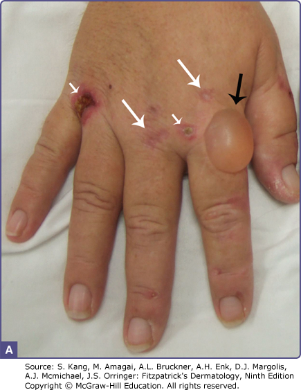 A 38-year-old woman presents with a 4-month history of recurring blistering lesions on her hands, forearms, and face. Physical examination reveals multiple tense blisters and erosions with surrounding erythema and several scars in these areas as shown below.