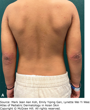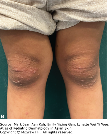 Rationale: Gianotti-Crosti syndrome, also known as papular acrodermatitis of childhood, presents as an acute eruption of flat-topped papules or papulovesicles on the extensor surfaces of the extremities, buttocks, and face with sparing of the flexural surfaces. It tends to affect children and patients with atopic dermatitis are at higher risk of developing this eruption. Differential diagnoses include hand, foot, and mouth disease, papular urticaria, IgA vasculitis, lichen planus, and molluscum contagiosum. The eruption is self-limited and tends to fade over a period of 3-4 weeks.