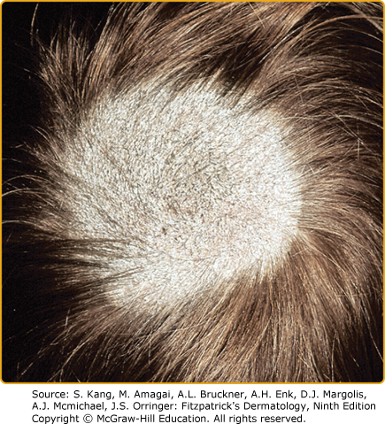Rationale: The vignette consists of a patient with a circular patch of hair loss, the presence of scale, small fractured hairs, and palpable lymphadenopathy which is consistent with tinea capitis. Fungal culture can confirm the diagnosis and determine the specific pathogen. The most common pathogenic fungi varies based on the country of origin. Below are several other examples of tinea capitis - note the presence of annular papules on the face in the first picture which can be a clue to the diagnosis.