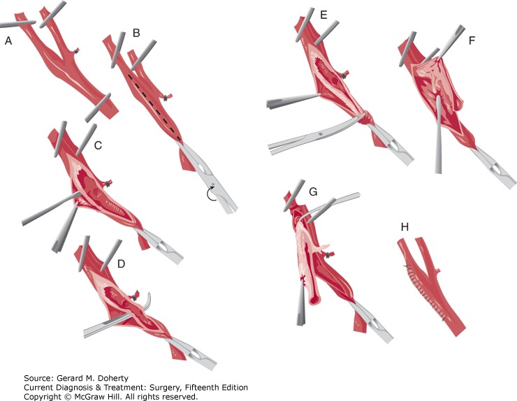 Figure Legend: Technique of carotid endarterectomy. Arteries, Doherty GM. Current Diagnosis & Treatment: Surgery, 15e; 2020.