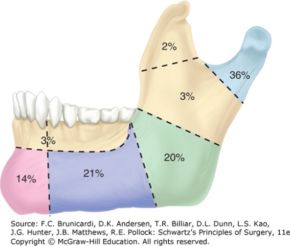 Figure legend: Sites of common mandible fractures. Disorders of the Head and Neck, Brunicardi F, Andersen DK, Billiar TR, Dunn DL, Kao LS, Hunter JG, Matthews JB, Pollock RE. Schwartz's Principles of Surgery, 11e; 2019.