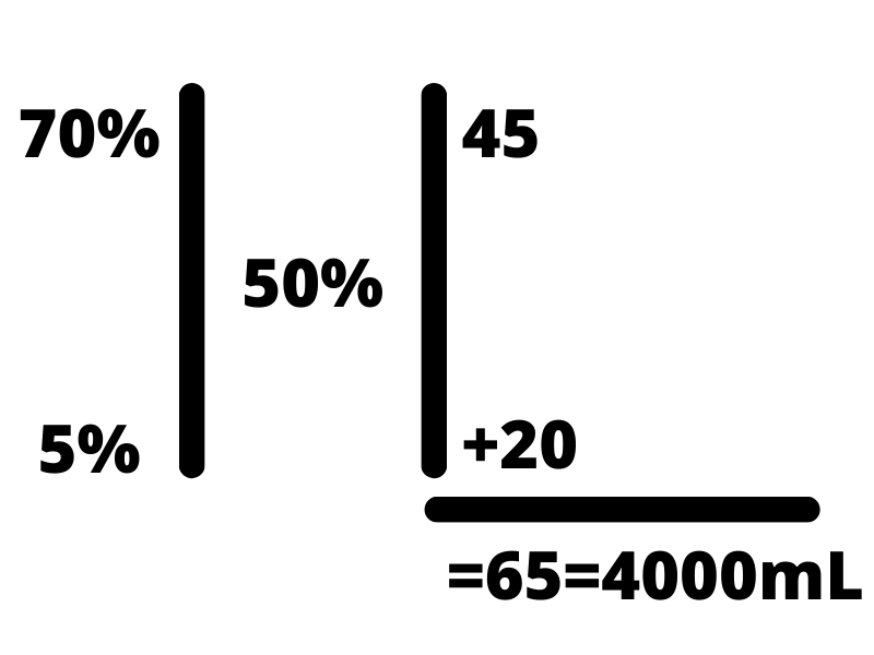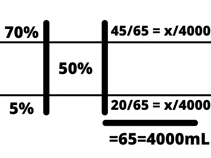 The first step is to draw two vertical parallel lines, placing the desired concentration (i.e. D50W is 50%) in the center. From there, put the two concentrations you have on the left side, the highest concentration in the top left and the lower in the bottom left. From there, subtract the desired concentration from the top left concentration and write that on the bottom right-hand corner. Next, subtract the lower-left concentration from the desired concentration in the middle and write that number in the top right. Total up the two numbers on the right-hand side and write that below. The total volume we are trying to make in this instance is 4000 mL, so we set that equal to the total of the right side.