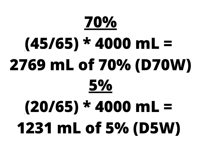 Dextrose is equivalent to 3.4 kcal/ gram. D5W solutions contain 5 g / 100 mL, D50W contains 50 g / 100 mL, and D70W contains 70 g / 100 mL. The resident wants 6800 kcal of D50W, which has 6800 kcal / 3.4 kcal/g Dextrose = 2000 g Dextrose needed. As this needs to be D50W, that means the prepared solution will be 50g/100 mL and you can set up a proportion to determine the final volume of D50W: 2000 g / x mL = 50 g / 100 mL, solving for x gives you a final volume of 4000 mL. From here, the easiest way to solve this type of problem is to utilize allegation, sometimes referred to as “Tic-Tac-Toe math”.