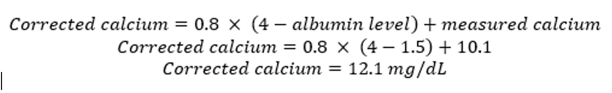 Answer B is correct. IQ’s true calcium level, after correction for hypoalbuminemia, is 12.1 mg/dL, as calculated above. This value is consistent with hypercalcemia, which can be explained by the symptoms he presented with.