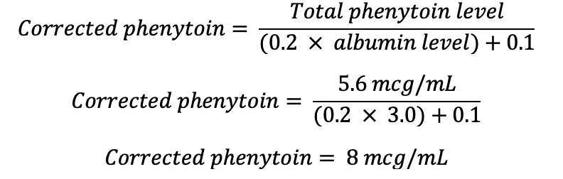 Answer D is incorrect. CX’s true total phenytoin level, after correction for hypoalbuminemia, is 8 mcg/mL, as calculated above. This value is NOT above the therapeutic range of 10-20 mcg/mL.