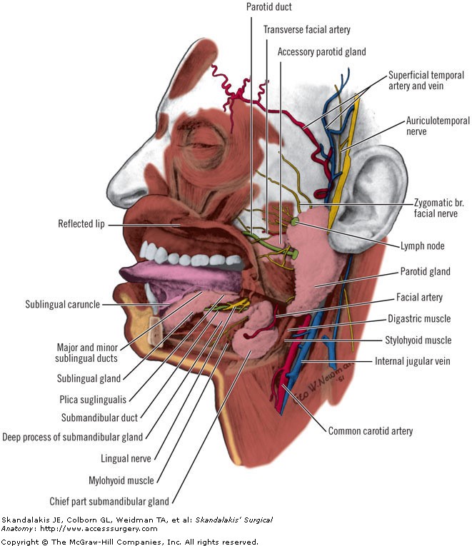 Figure legend: Salivary glands and their ducts. Dissection showing the sublingual, submandibular (submaxillary), and parotid glands. Deep lateral view of the lingual region with the body and part of the ramus of the mandible cut away to expose the glands and related structures. (Modified from Anson BJ (ed). Morris' Human Anatomy (12th ed). New York: McGraw-Hill, 1966; with permission.)